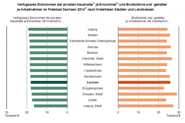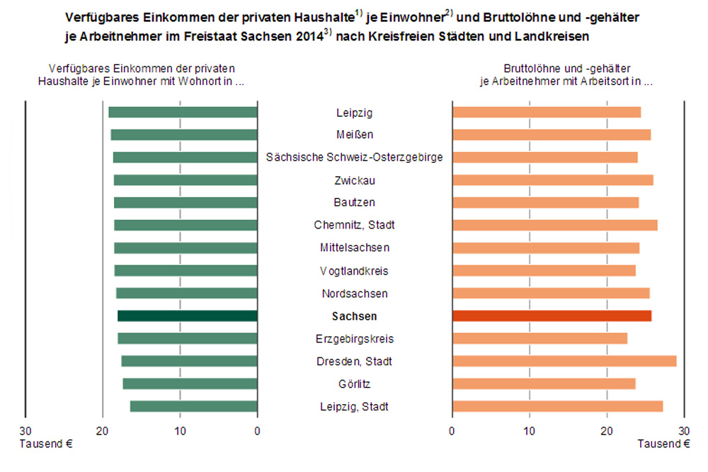 Oder mit den Worten der Statistiker: „Ein Vergleich der Verfügbaren Pro-Kopf Einkommen mit den am jeweiligen Arbeitsort erzielten Bruttolöhnen und -gehältern zeigt, dass die in den Kreisfreien Städten erreichten höheren Verdienste der Arbeitnehmer durch den Transfer des Einkommens der Pendler auch in die Umlandkreise gelangen. Zu berücksichtigen ist auch der Einfluss der Einwohnerzahl, die im Vergleich zu 2013 nur in den Kreisfreien Städten und am deutlichsten in der Stadt Leipzig angestiegen ist.“