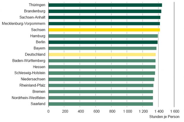 Während in den sechs östlichen Ländern die Durchschnittszeit je Erwerbstätigen 1.421 Stunden betrug, kamen die Beschäftigten in den alten Ländern (ohne Berlin) auf eine Pro-Kopf-Arbeitszeit von 1.356 Stunden.