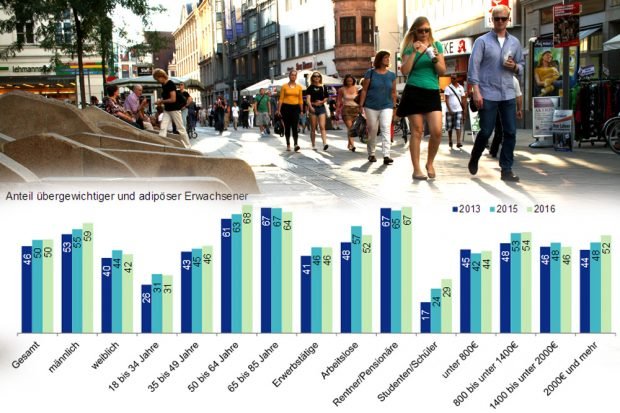 Und da wächst was nach. Denn aufgefüllt wird diese Gruppe ja durch die 50- bis 64-Jährigen, wo binnen dieser wenigen Jahre (2013 bis 2016) der Anteil der Übergewichtigen von 61 auf 68 Prozent gestiegen ist. Und das trotz aller Forschungs- und Begleitprogramme der Uni Leipzig.