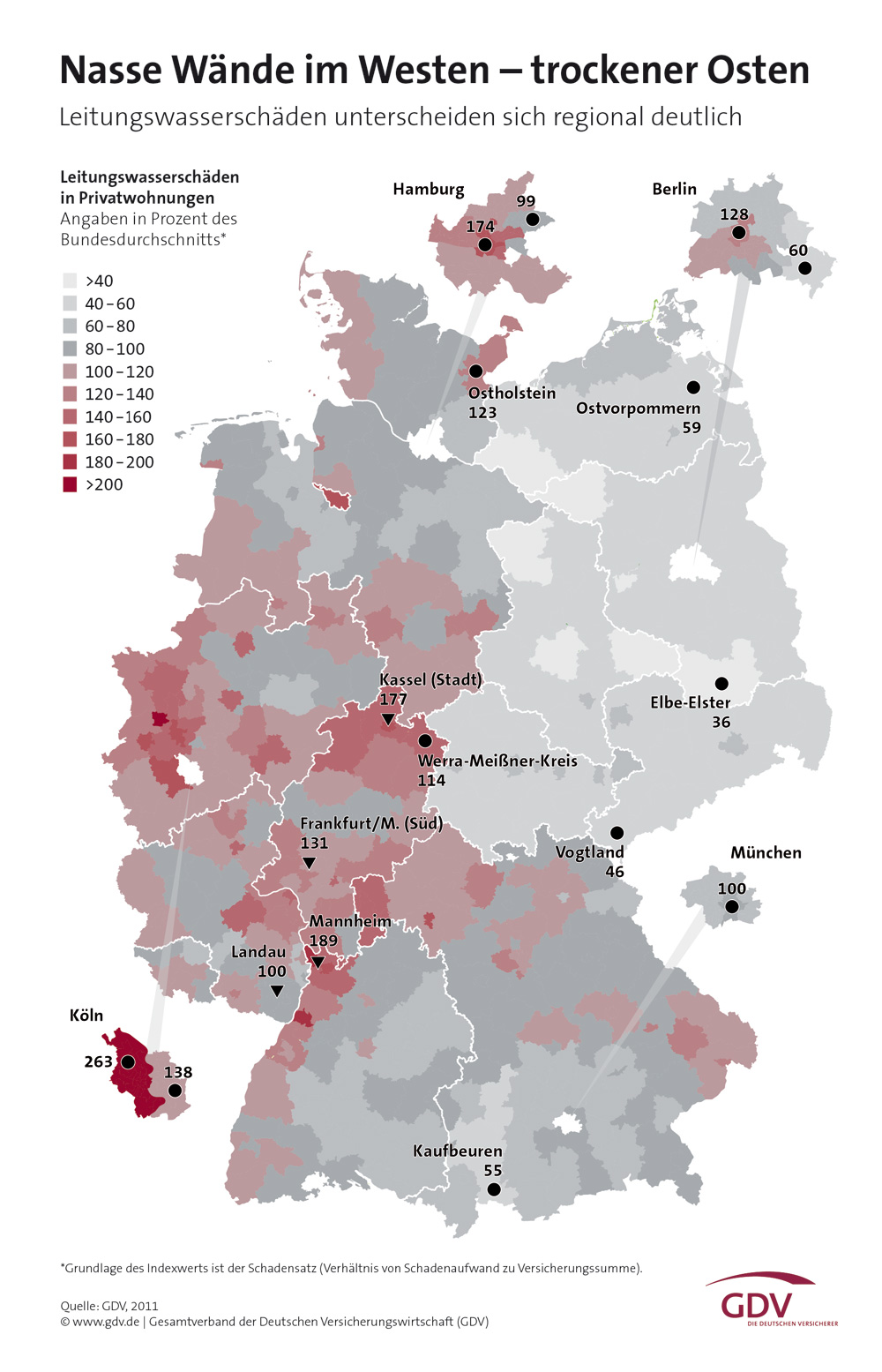 Der Vergleich, den auch der GDV zieht, ist eindeutig: „Flächendeckend treten Leitungswasserschäden in Ostdeutschland seltener auf als in Westdeutschland. In keinem einzigen Landkreis in den neuen Ländern liegt der Schadenindex über 80. Der brandenburgische Landkreis Elbe-Elster weist mit 36 den niedrigsten Wert deutschlandweit auf. Mit Krefeld, Mannheim oder Karlsruhe verzeichnen dagegen viele westdeutsche Städte überdurchschnittlich oft Wasserschäden. Spitzenreiter ist Köln: In der Innen- und Südstadt ist der Index für Leitungswasserschäden mit 263 mehr als doppelt so hoch wie im Bundesdurchschnitt.“