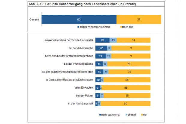 Zumindest ist die Sensibilität da. Was beim Behördengang besonders deutlich wird, wo das Gefühl der Benachteiligung bei allen Jahrgängen (außer den Senioren) besonders hoch ist: zwischen 24 und 30 Prozent haben sich dort schon einmal benachteiligt gefühlt.