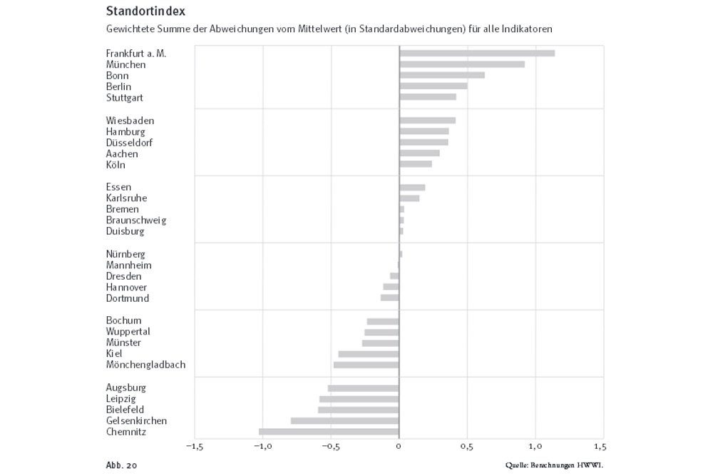 Denn die Indikatoren, die auch das HWWI nur heranziehen kann, sind die üblichen, die man in den offiziellen Statistiken der Bundes-, Landes- und kommunalen Statistikämter findet. Daten zur Bevölkerungsentwicklung, zu Schulabschlüssen, zu Wirtschaftsumsatz, Erwerbstätigenrechnung, Forschungsbereichen, Tourismusübernachtungen, Studierendenzahlen und – in diesem Fall mal ein Alleinstellungsmerkmal – Fahrzeiten zu Flughäfen, Autobahnanschlüssen und ICE-Bahnhöfen aus dem Bundesinstitut für Bau-, Stadt- und Raumforschung (BBSR).