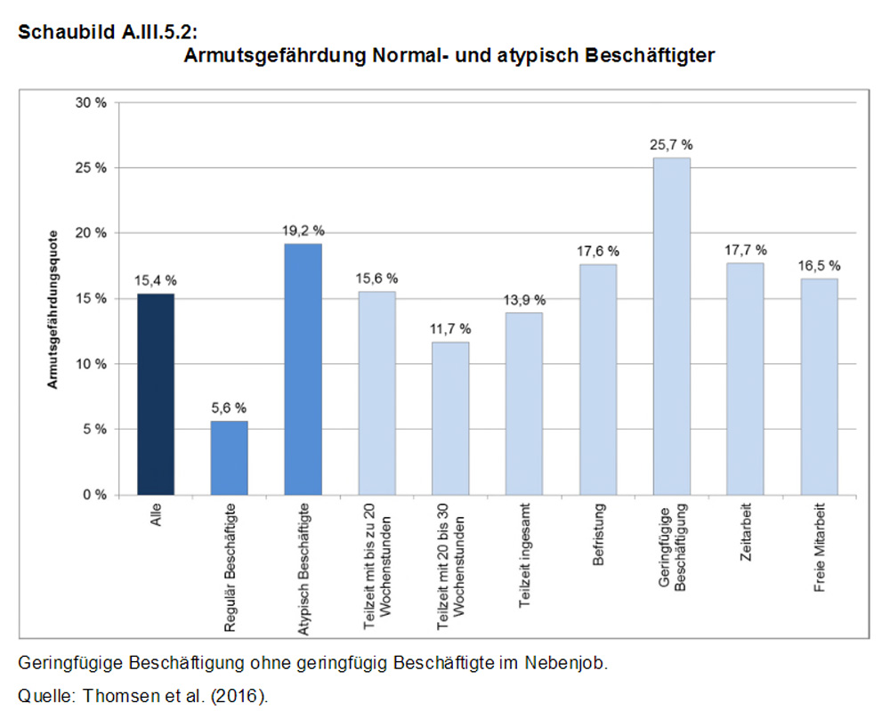 Der Bericht der Bundesregierung hatte auch schon das Augenmerk darauf gelegt, dass bestimmte Bevölkerungsgruppen stärker als andere von Armut betroffen sind. Unter anderem, weil sie eben nicht so einfach in eine hinlänglich bezahlte Vollzeitbeschäftigung kommen. Denn wer eine reguläre Beschäftigung hat, gerät nur mit 5,6 Prozent in eine Armutsgefährdung. Wer aber in einem der vielen prekären und unsicheren Beschäftigungsverhältnisse landet, die in den vergangenen 20 Jahren entstanden sind, hat meist eine Gefährdungsquote von 15 bis 20 Prozent. Und die Zahlen zeigen auch, dass insbesondere Behinderte und Alleinerziehende nach wie vor Schwierigkeiten haben, eine vollwertige Beschäftigung zu bekommen.