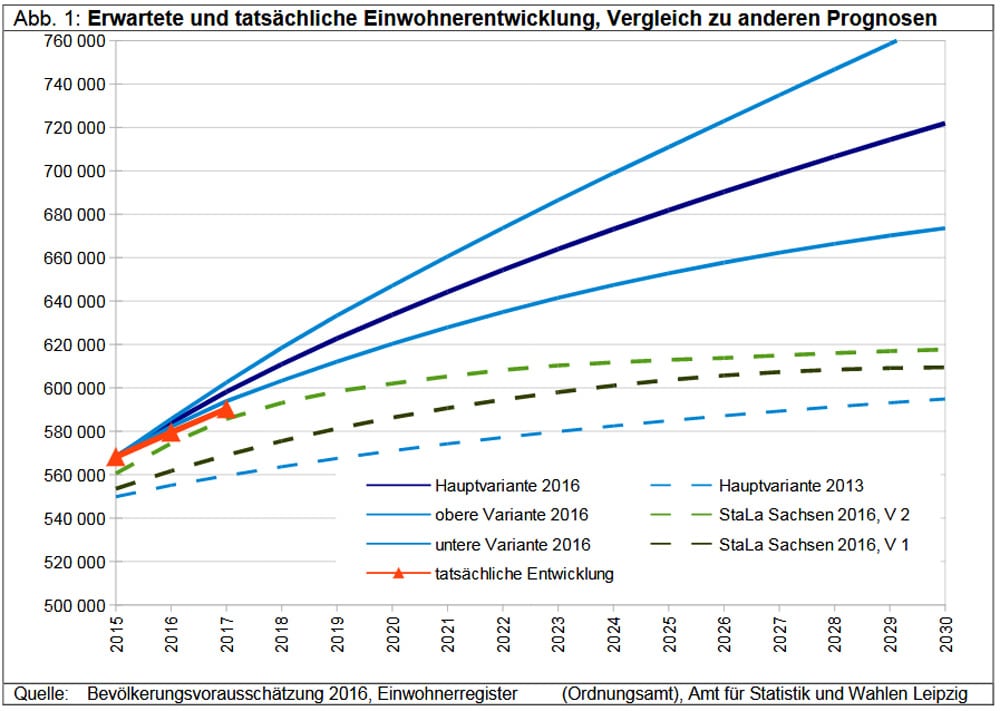 Und die Entwicklungen im Jahr 2018 werden einen starken Einfluss haben. Denn mittlerweile schlagen ja auch andere Einflüsse zu, die eine mögliche Zuwanderung bremsen. Denn einige Bauvorhaben, die 2016 noch in die Berechnung eingeflossen sind, sind bis jetzt nicht gekommen – das betrifft die Wohngebiete am Lindenauer Hafen genauso wie die Planungen in Meusdorf. Was 2018 tatsächlich passiert, wissen wir ja noch nicht wirklich.