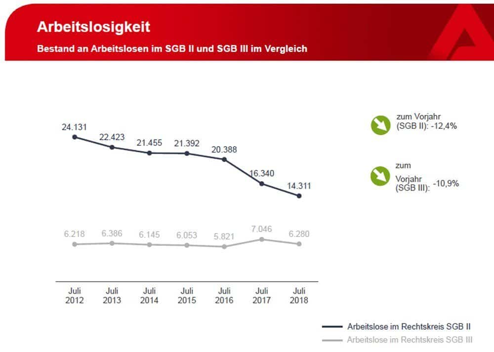 Insgesamt waren Ende Juli in der Stadt Leipzig 20.591 Menschen, 299 mehr als im Juni, bei der Arbeitsagentur und dem Jobcenter, arbeitslos gemeldet. Im Vergleich zum Juli 2017 sank die Arbeitslosigkeit um 2.795.