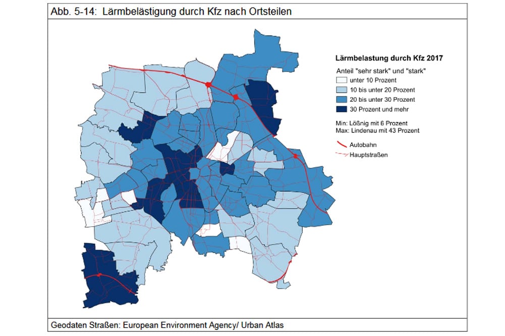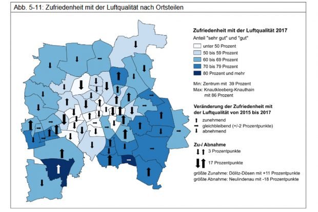 Während am Stadtrand teilweise über 80 Prozent der Einwohner zufrieden sind mit der Luftqualität, sinkt dieser Wert in den gerade stark mit Verkehr belasteten Ortsteilen deutlich unter 50 Prozent. Das betrifft die Innenstadt genauso wie die Südvorstadt, Lindenau und Plagwitz, Neustadt und Reudnitz.
