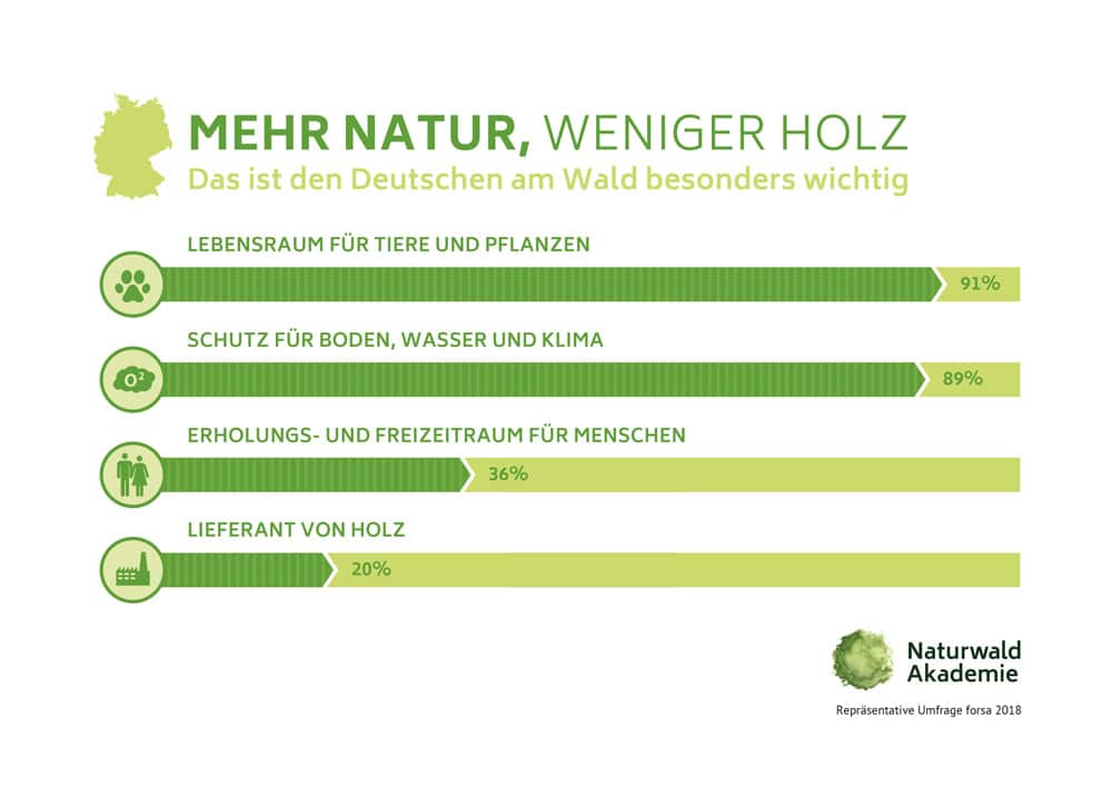 Das Forsa-Institut hat im Auftrag der Naturwald Akademie repräsentativ 1.000 Bürger im Spätsommer 2018 zur „Bedeutung des Waldes“ befragt.