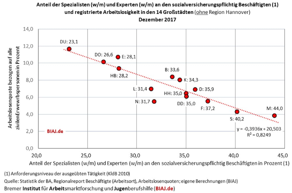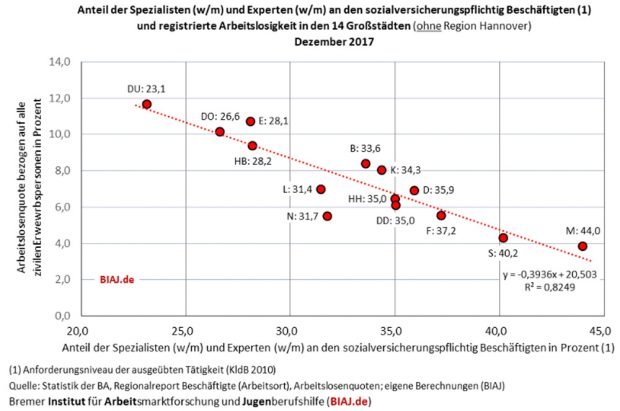 Sein Kommentar: „Ein Vergleich des Anteils der sozialversicherungspflichtig Beschäftigten in Berufen mit einem Anforderungsniveau 3 Spezialist/Spezialistin) bzw. 4 (Experte/Expertin) der ausgeübten Tätigkeit (Klassifikation der Berufe 2010) mit den Arbeitslosenquoten in den 14 Großstädten in der Bundesrepublik Deutschland (ohne die Region Hannover) im Dezember 2017 zeigt: Je höher der Anteil der sozialversicherungspflichtig Beschäftigten, deren ausgeübte Tätigkeit dem Anforderungsniveau 3 (Spezialist/Spezialistin) bzw. 4 (Experte/Expertin) entspricht, je geringer ist die in der jeweiligen Großstadt registrierte Arbeitslosigkeit (Arbeitslosenquote).“
