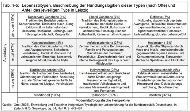 Deswegen findet man in Leipzig garantiert jede Menge „Reflexive“ und auch moderne Menschen ganz unten, in einer Lebenswelt mit „niedrigem Ausstattungsgrad“. Was wohl auch auf jüngere Akademiker zutrifft, wenn man nur an die miserablen Beschäftigungsverhältnisse im Hochschulbereich denkt.