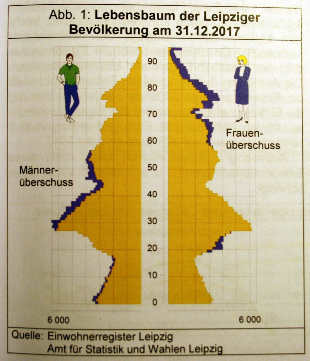 Denn dass Leipzig so ab dem 28. Lebensjahr einen deutlichen Männerüberschuss hat, darf schon verwundern, wenn doch Leipzigs Hochschulen besonders viele Frauen anziehen. Vom 19. bis 24. Lebensjahr hat Leipzig einen Frauenüberschuss. Und dann? Die Antwort kann nur lauten: Dann verliert Leipzig die jungen Frauen wieder, weil die Stadt diesen gut ausgebildeten Frauen keine ordentlichen Jobs anbieten kann.