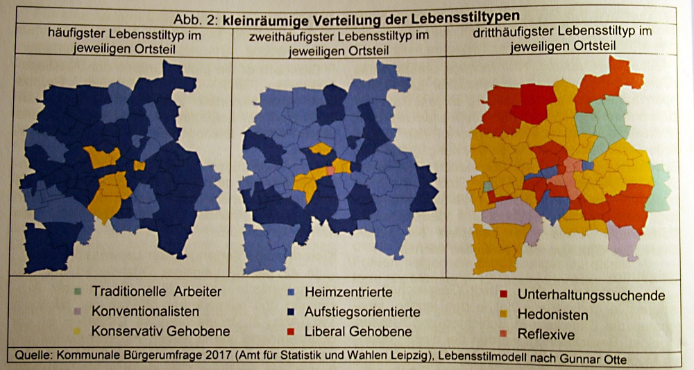 Auffällig sind die Lebensgenießer, die „Hedonisten“, die ausgerechnet dort dominieren, wo Linke und Grüne ihre höchsten Wahlergebnisse in Leipzig einfahren: in Südvorstadt, Connewitz, Waldstraßenviertel. Was sich möglicherweise deckt mit „Stilprotest“ und „gegenwartsbezogener Genuss- und Konsumorientierung“. Aber wo bleiben da die Nachdenklichen, die Reflexiven, die in keinem einzigen Ortsteil wirklich die dominierende Gruppe sind?