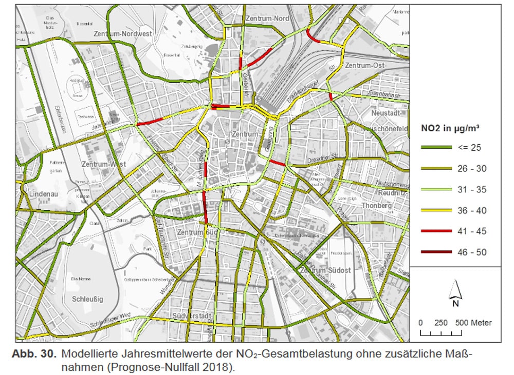 „Neben den Luftschadstoffmessungen lassen die Ergebnisse aus Luftschadstoffberechnungen erkennen, dass im Jahr 2015 in Leipzig etwa 2.000 Bewohner einer oberhalb des Grenzwertes liegenden Belastung mit Stickstoffdioxid ausgesetzt waren. Nach rechnerischer Prognose werden auch im Jahr 2020 noch etwa 600 Bewohner von einer mehr als zulässigen Stickstoffdioxidbelastung betroffen sein. Neben Stickstoffdioxid liegt der Fokus auch auf einer zu hohen Feinstaub-(PM10-) Belastung, der im Jahr 2020 etwa 470 Menschen voraussichtlich ausgesetzt sein werden“, interpretiert das Umweltdezernat die errechneten Zahlen.