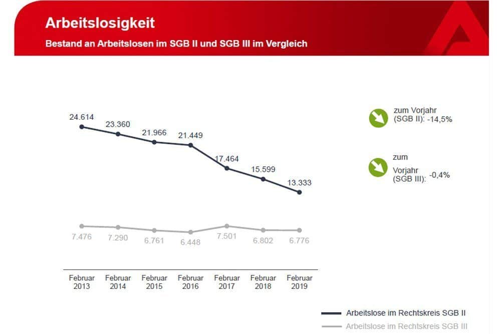 Im Februar waren 6.776 Menschen in der Arbeitsagentur, im Rechtskreis SGB III, arbeitslos gemeldet. Das waren 110 weniger als im Vormonat und 26 weniger als im Februar 2018.