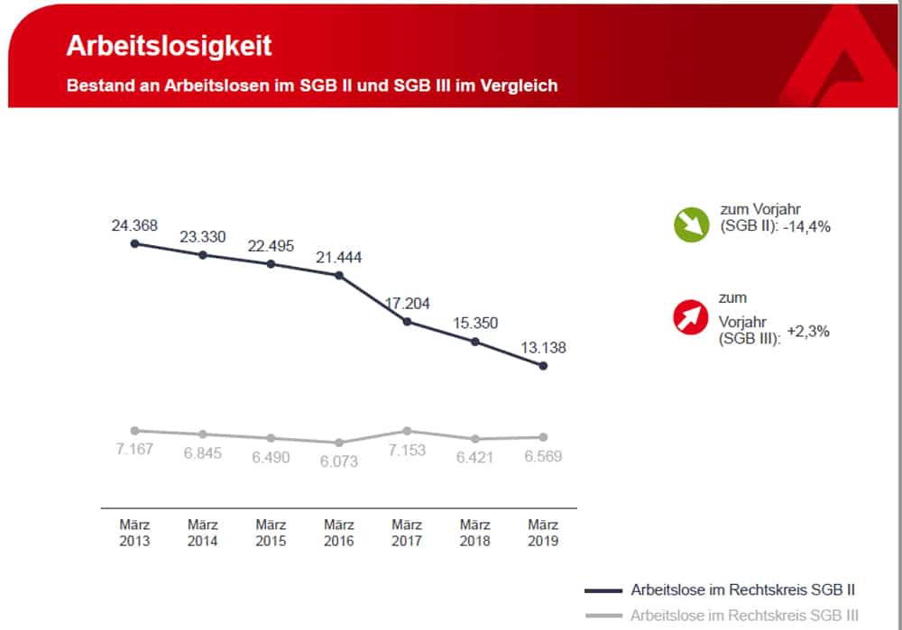 Insgesamt waren im März 19.707 (Vormonat 20.109) Männer und Frauen in Leipzig arbeitslos gemeldet. Damit ist die Arbeitslosenzahl wieder unter die 20.000er Marke gesunken. Zuletzt war diese Marke im Dezember 2018 unterschritten worden. Der Rückgang im Vergleich zum Februar 2019 betrug 402 Personen. Der Rückgang zur Zahl der arbeitslosen Menschen im März 2018 betrug 2.064.
