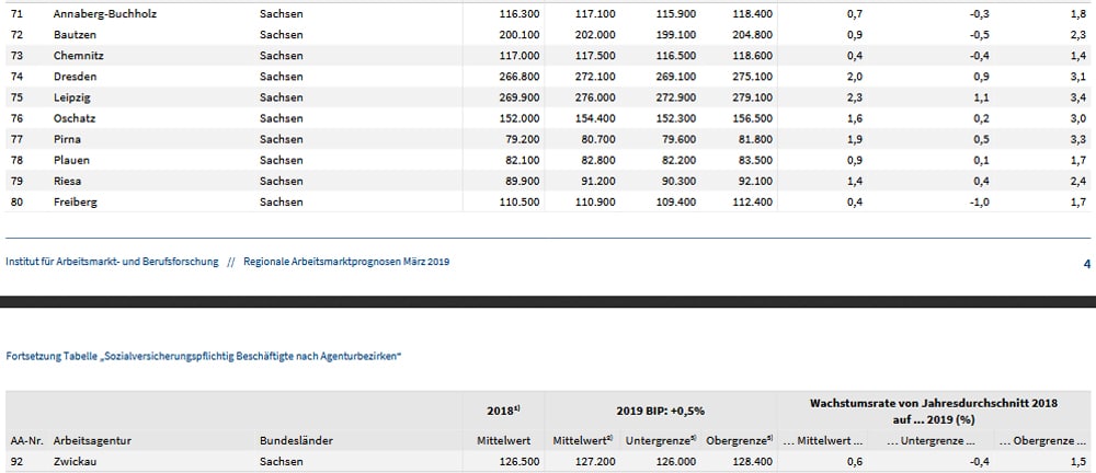 Das Institut für Arbeitsmarkt und Berufsforschung (IAB) der Bundesagentur für Arbeit (BA) hat mit der Frühjahresprognose auch die Arbeitsmarktprognosen für das Jahr 2019 angepasst. Nach Meinung der Forscher wird der positive Trend auf dem sächsischen Arbeitsmarkt anhalten. Die Forscher rechnen bei einem Wachstum des realen Bruttoinlandsprodukts von 0,5 Prozent für Sachsen mit einem Beschäftigungsanstieg um rund 22.000 und einem Rückgang der Arbeitslosigkeit um über 10.000 Menschen.