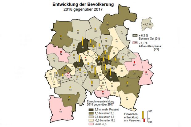 „Die Ortsteile mit dem 2018 größten Einwohnerzuwachs unterscheiden sich von denen der Vorjahre“, schreibt Andreas Martin in seinem zugehörigen Beitrag im Quartalsbericht. „Statt Volkmarsdorf, Neustadt-Neuschönefeld und Zentrum-Südost waren Möckern, Stötteritz und die Südvorstadt die größten Magneten; Ortsteile, in denen auch größere Wohnungsbauvorhaben umgesetzt wurden. Der Trend der Verlagerung des Einwohnerzuwachses von den zentralen bzw. ‚angesagten‘ Ortsteilen – diese sind ‚voll‘ – in innenstadtfernere Bereiche der Stadt mit solider Bausubstanz und verkehrsgünstiger Anbindung setzte sich fort.“