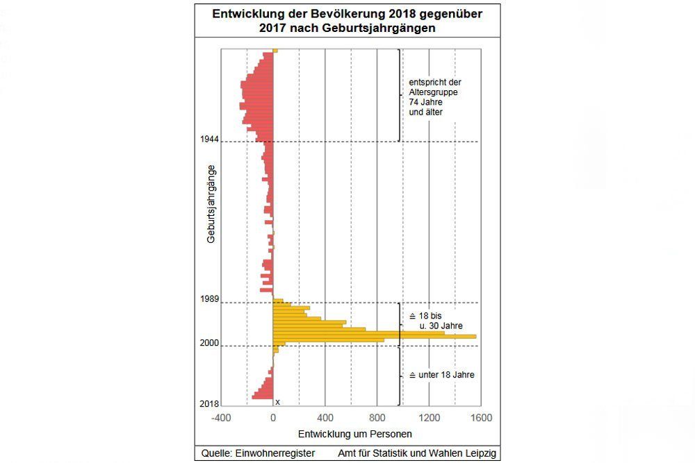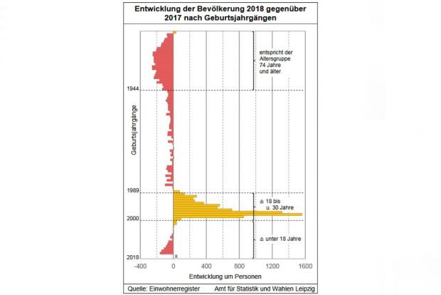 „Die Altersstruktur der Leipziger Bevölkerung wurde auch 2018 maßgeblich durch Zu- und Weggezogene beeinflusst“, schreibt Martin. „Die bereits zuvor stärksten Altersklassen (20 und 40 Jahre) wurden auch im Berichtsjahr wiederum primär verstärkt. Leicht versetzt zu dieser Gruppe sind es fast ausschließlich die 18- bis unter 30-Jährigen, die mit einem Zuwachs von 6.899 Personen für die Zunahme der Gesamtbevölkerung verantwortlich waren. Für diese Gruppe wurden auch mit 18.344 Zugezogenen (bei gleichzeitig 11.417 Weggezogenen) über die Hälfte aller Zuzüge (54,1 Prozent; Wegzüge: 42,4 Prozent) registriert.“