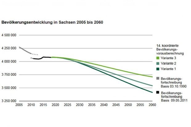 Es könnte sogar noch deprimierender werden: In Sachsen sollen nach aktuellen Berechnungen im Jahr 2060 zwischen 3,4 Millionen und 3,7 Millionen Personen leben. Dies bedeutet einen Bevölkerungsrückgang um 369.000 bis 663.000 Personen bzw. 9 bis 16 Prozent im Vergleich zum Jahr 2018, teilt das Statistische Landesamt mit. Voraussichtlich bis zum Jahr 2032 wird damit Sachsens Bevölkerung unter 4 Millionen fallen.