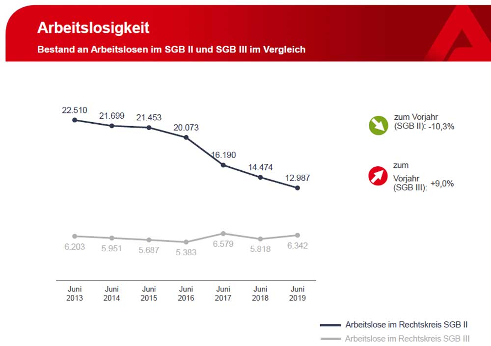 Insgesamt waren im Juni 19.329 (Vormonat 19.539) Männer und Frauen in Leipzig arbeitslos gemeldet. Der Rückgang im Vergleich zum Mai betrug 210 Personen und innerhalb der letzten 12 Monate ist die Zahl der arbeitslos gemeldeten Menschen in Leipzig um 963 zurückgegangen.