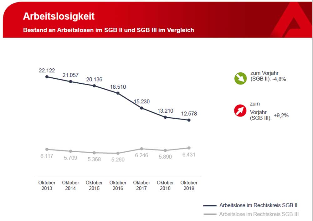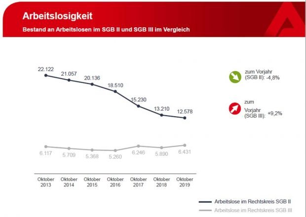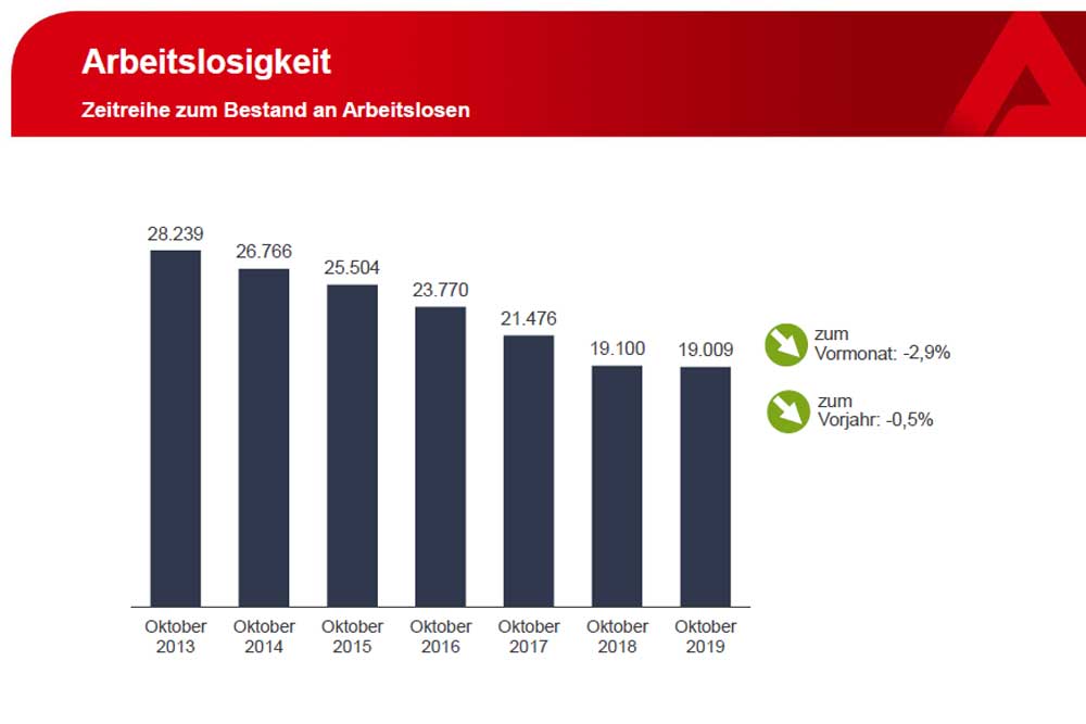 Gegenüber dem Vormonat fiel die Zahl der als Langzeitarbeitslose gezählten um 23 auf 4.498. Im Vergleich zum Oktober 2018 gab es 445 langzeitarbeitslose Menschen weniger.