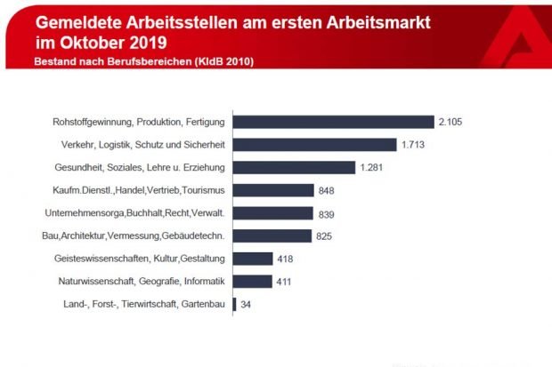 Top 10 der angebotenen Ausbildungsberufe: An erster Stelle lag die Zahl der Ausbildungsstellen zur Kauffrau/mann im Einzelhandel (202 Ausbildungsstellen), weiterhin stark nachgefragt waren Kauffrau/mann Büromanagement (191), Verkäufer/in (134), Fachkraft Lagerlogistik (104), Eisenbahner/in im Betriebsdienst (98), Koch/Köchin (90) Zahnmedizinische Fachangestellte/r (81), Kfz.- Mechatroniker/in (73), Restaurantfachmann/frau (77), Mechatroniker/in (68) und Hotelfachmann/frau (67). 2.089 Ausbildungsstellen wurden für weitere Berufe gemeldet.
