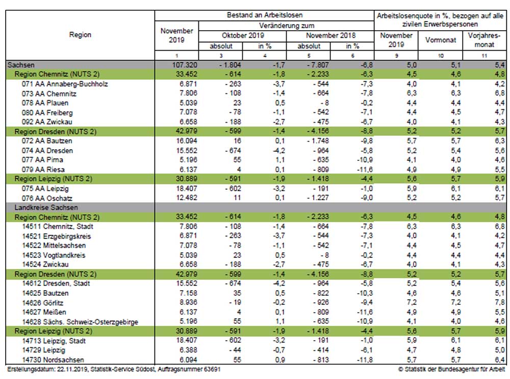 Wobei der Blick auf Leipzig kein komplettes Bild zeigt. Denn Leipzig funktioniert – genauso wie Dresden – als Jobmaschine für eine ganze Region. Dadurch, dass über all die Jahre junge Leute aus den Landkreisen nach Leipzig zogen, weil hier die neuen Arbeitsplätze entstanden, hat das natürlich in ländlichen Regionen die Arbeitslosigkeit früher und deutlicher gesenkt. Der Freistaat Sachsen verzeichnet im November eine Gesamtarbeitslosenquote von 5,0 Prozent.