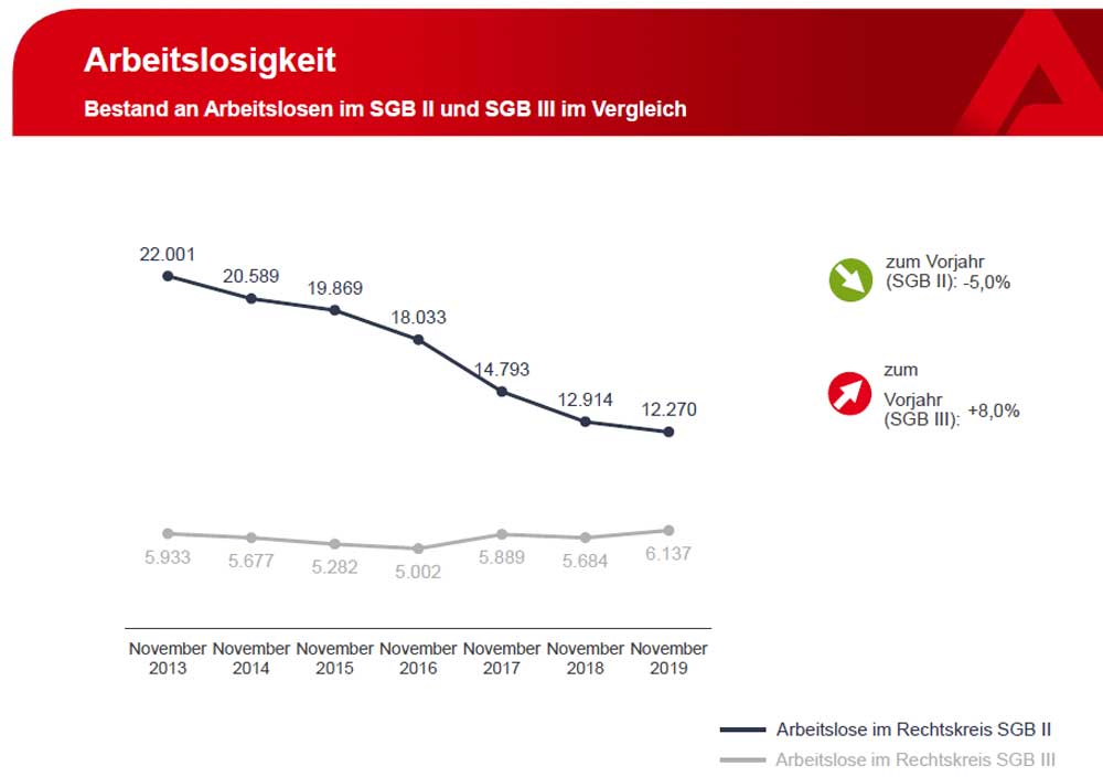 Im Jobcenter und damit im Rechtskreis SGB II waren 12.270 Menschen arbeitslos registriert. Das waren 308 weniger als im Oktober 2019 und 644 weniger als vor einem Jahr.
