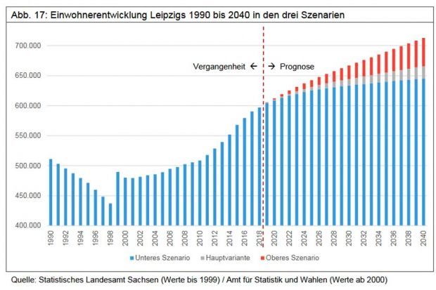 Und das alles in der knappen Zusammenfassung der Stadtratsvorlage: „Zum Prognosehorizont 2040 wird in der Hauptvariante nun eine Einwohnerzahl von rund 665.000 erwartet. Aus dem oberen und unteren Szenario der Bevölkerungsvorausschätzung ergibt sich ein Korridor der möglichen Bevölkerungsentwicklung, dessen Grenzen im Jahr 2040 bei rund 644.000 und 713.000 Einwohnerinnen und Einwohnern liegen. Die Stadt Leipzig befindet sich gemäß den Ergebnissen der Bevölkerungsvorausschätzung 2019 weiterhin auf einem Pfad des Bevölkerungswachstums, aber nicht mehr in der rasanten Geschwindigkeit, von der noch 2016 ausgegangen wurde. Der in der Hauptvariante der vorhergehenden Vorausschätzung erwartete Bevölkerungsanstieg auf mehr als 700.000 Personen ist damit weiterhin denkbar, allerdings wird sich dieser Wachstumsprozess über einen längeren Zeithorizont bis zum Jahr 2040 oder darüber hinaus erstrecken.“