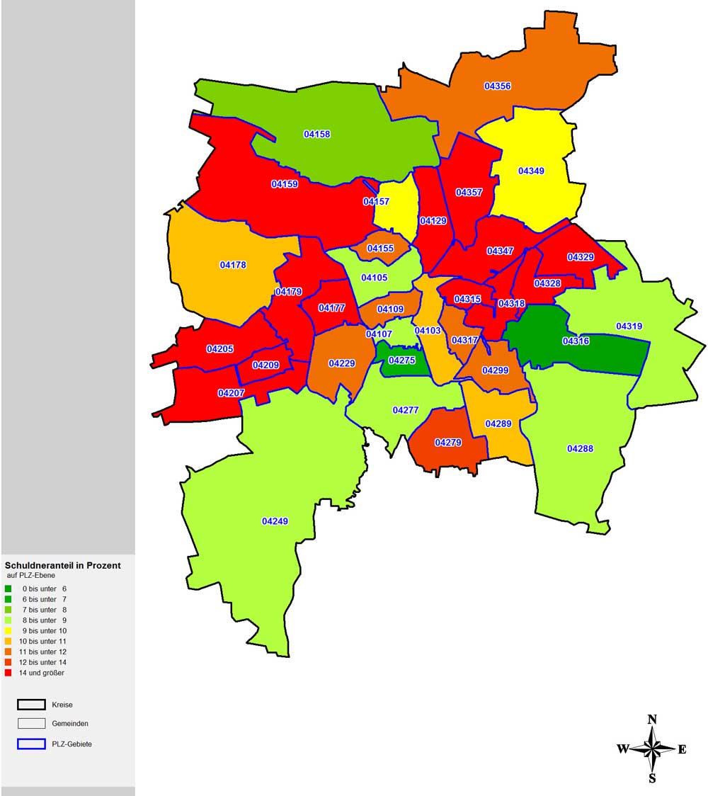 Womit Leipzig keine Ausnahme ist. Nur wird hier – ortsteilgenau – sichtbar, wer eigentlich unter den ganzen Arbeitsmarktreformen der letzten 20, 25 Jahre am meisten gelitten hat – nämlich mit Arbeitseinkommen abgespeist wurde, die keinerlei Sicherheit bieten, beim kleinsten Unglücksfall in dauerhafte Verschuldung abzustürzen und mit Schuldensummen konfrontiert zu werden, die mit den mageren Einkommen nicht abgetragen werden können.