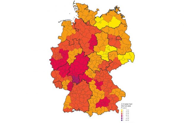 Befragt wurden damals 5.585 Bundesbürger per Telefon. Auf Kreisebene bekommt man dann keine wirklich belastbaren Ergebnisse mehr, auch wenn die Studienautorin betont: „Die Stichprobe wurde dabei so gezogen, dass in jedem der aktuell 401 deutschen Landkreise und Kreisfreien Städte mindestens zehn Personen befragt wurden.“