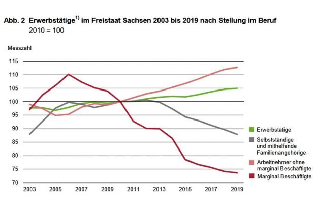 Dieser Effekt ist auch in der Tabelle für 2019 zu sehen: In allen Wirtschaftsbereichen stieg in Sachsen die Zahl der Beschäftigten, nur in zwei Bereichen nicht: einmal der krisengebeutelten Landwirtschaft und zum anderen war es die Kategorie „Grundstücks- und Wohnungswesen, Finanz- und Unternehmensdienstleister“. Und in den „Unternehmensdienstleistern“ stecken die Leiharbeitsfirmen, die ihren Personalstamm nun seit Jahren immer weiter abbauen müssen.