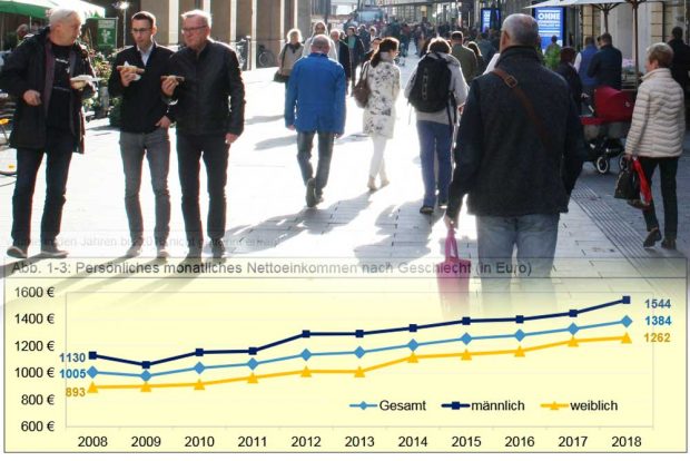 Was daran liegt, dass die Männer ihr persönliches monatliches Nettoeinkommen um 100 Euro steigern konnten, Frauen nur um 26 Euro. Die Lücke klafft also weiter auseinander. Männer können auch größere Lohnsteigerungen durchsetzen als Frauen.