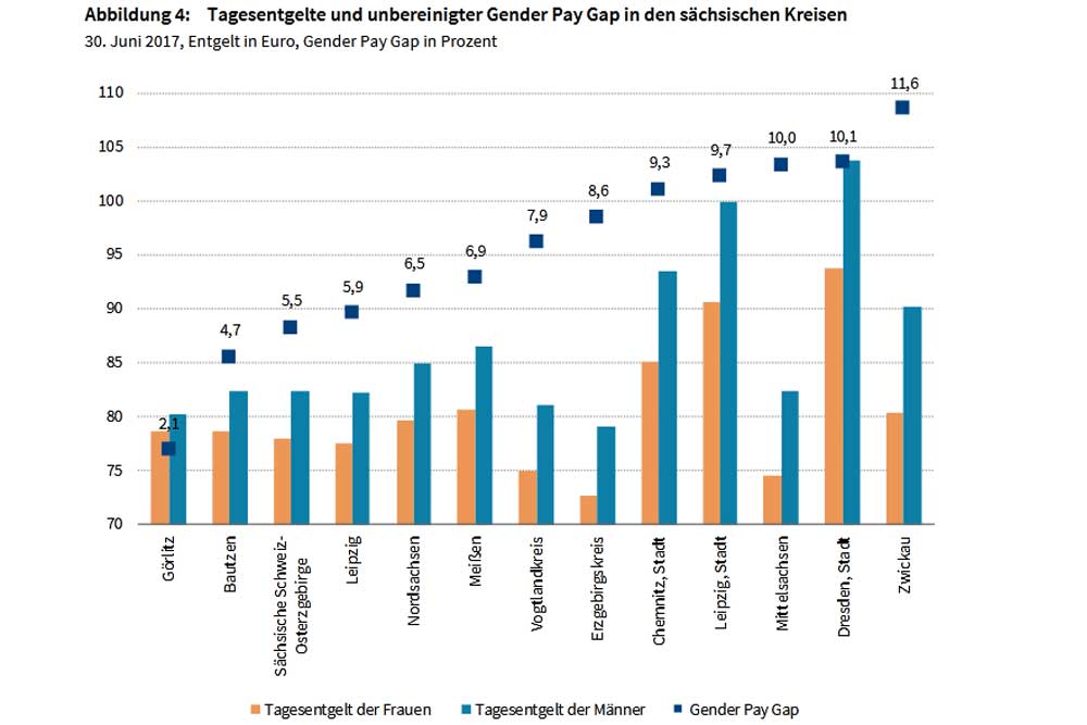 Der Gender Pay Gap auf regionaler Ebene ist hauptsächlich durch das Entgelt der Männer beeinflusst. So liegt beispielsweise das Tagesentgelt der Männer in Dresden bei 103,73 Euro, das Tagesentgelt der Frauen in Dresden bei 93,79 Euro. Damit ist der Unterschied im Tagesentgelt in Dresden sachsenweit mit am höchsten – nur Zwickau hat einen höheren Gender Pay Gap. Mit dem Blick auf sächsische Regionen zeigt sich, dass in Großstädten höhere Löhne gezahlt werden. In Südwestsachsen ist festzustellen, dass die Tagesentgelte für Männer und Frauen geringer sind, jedoch Männer wegen besser bezahlter Industriearbeitsplätze mehr verdienen als Frauen.