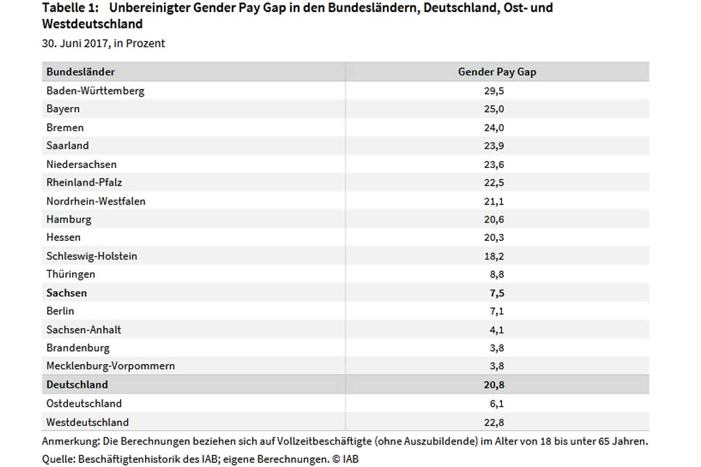 In Sachsen verdienen die Frauen im Schnitt 7,5 Prozent weniger als Männer. Der Gender Pay Gap liegt damit deutlich unter dem bundesweiten Durchschnitt von 20,8 Prozent. Geringer ist der Gender Pay Gap nur in Berlin (7,1 Prozent), Sachsen-Anhalt (4,1 Prozent) sowie Brandenburg und Mecklenburg-Vorpommern (jeweils 3,8 Prozent). Den höchsten Gender Pay Gap gibt es in Baden-Württemberg (29,5 Prozent) und Bayern (25 Prozent). Auffällig ist der Ost-West-Unterschied à ostdeutsche Länder sind einstellig und westdeutsche zweistellig.