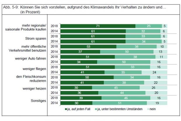 Und waren es 2014 noch 61 Prozent, die der Aussage zustimmten „Es beunruhigt mich, wenn ich daran denke, unter welchen Umweltverhältnissen meine Kinder und Enkelkinder wahrscheinlich leben werden“, so stieg der Wert jetzt auf 70 Prozent.