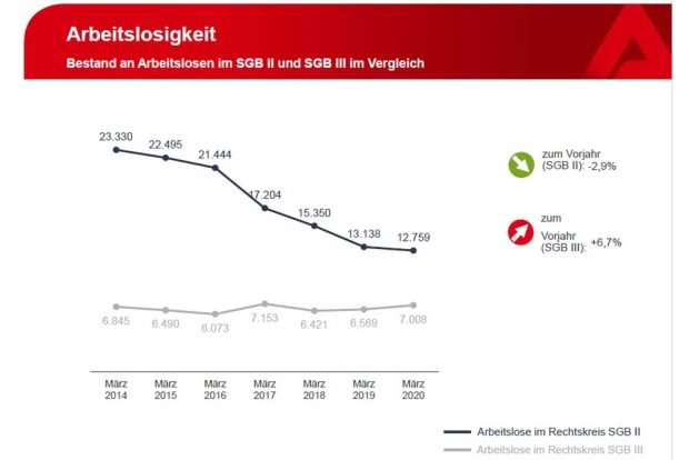 Die Zahl der langzeitarbeitslosen Menschen stagnierte im März. Gegenüber dem Vormonat stieg sie um 4 Personen an auf 4.550. Im Vergleich zum März 2019 gab es 94 Langzeitarbeitslose weniger.