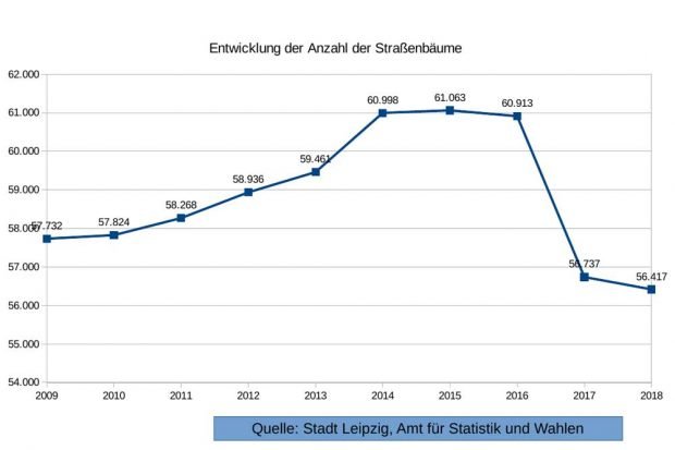 Was aber für 2018 (?) trotzdem nur 56.729 Straßenbäume für Leipzig ergibt, also trotzdem weniger als 2009. Wahrscheinlich sind die Jahreszahlen noch nicht aktualisiert, sodass wir es hier mit den Zahlen von 2019 zu tun haben. Der Weg, auch nur die Zahlen von 2015 wieder zu erreichen, ist noch weit.