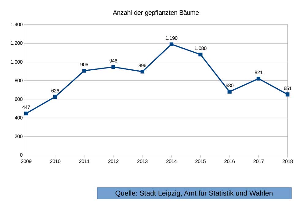 Tatsächlich hatte sich Leipzigs Verwaltung schon 2009 – mit dem damals beschlossenen Luftreinhalteplan – verpflichtet, allein von 2009 bis 2015 5.000 zusätzliche Straßenbäume zu pflanzen: „Verstärkte Begrünung von Straßenraum und Straßenrand (Vermeidung unbefestigter, vegetationsloser Flächen) – Erhöhung des Baumbestandes um 5.000 Bäume bis 2015 und Erhalt des Altbaumbestandes“, lautete der Punkt M4.2.