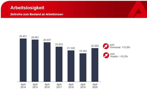 Insgesamt waren im April 22.892 (Vormonat 19.767) Männer und Frauen in Leipzig arbeitslos gemeldet. Der Anstieg im Vergleich zum März betrug 3.125 Personen. Im Vergleich zum April 2019 ist die Zahl der arbeitslos gemeldeten Menschen um 3.549 angewachsen.