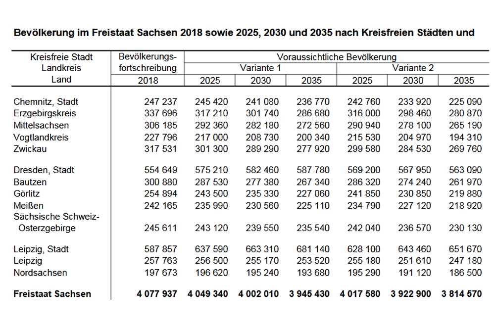 Und das, während das Statistische Landesamt für ganz Sachsen einen weiteren Rückgang der Bevölkerung in Aussicht stellt: „Am Jahresende 2018 lebten knapp 4,08 Millionen Einwohner und Einwohnerinnen in Sachsen. Im Jahr 2035 wird die Einwohnerzahl in Variante 1 voraussichtlich bei 3,95 beziehungsweise in Variante 2 bei 3,81 Millionen Personen liegen. Das bedeutet, 2035 leben voraussichtlich zwischen 13.2500 und 26.3400 bzw. 3,2 bis 6,5 Prozent weniger Menschen im Freistaat Sachsen als Ende 2018. Der Rückgang der Gesamteinwohnerzahl wird von einer fortgesetzten Alterung der Bevölkerung begleitet. Das Durchschnittsalter, ein Indikator für die Alterung einer Bevölkerung, steigt in Sachsen um etwa ein Jahr von derzeit 46,8 Jahre auf 47,4 Jahre bzw. 48,1 Jahre im Jahr 2035.“