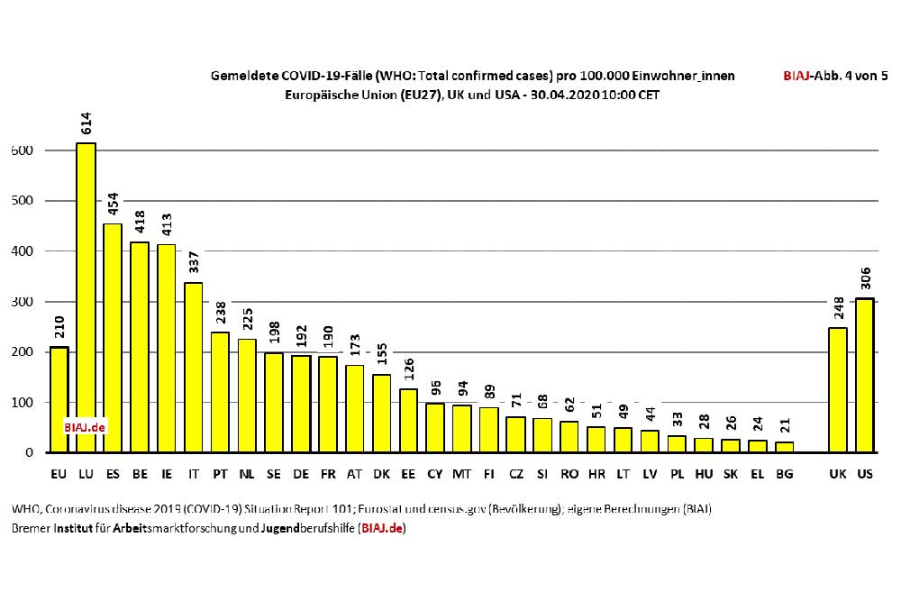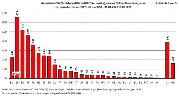 Wieder andere Länder haben sehr viele Menschen getestet, auch solche, die gar keine Krankheitssymptome haben. All das muss man mitbedenken, wenn man jetzt die Grafiken betrachtet, die Paul M. Schröder vom Bremer Institut für Arbeitsmarktforschung und Jugendberufshilfe (BIAJ) aufbereitet hat.
