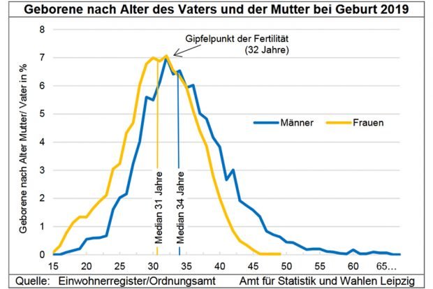 In ihrem Beitrag „Alter von Vätern bei der Geburt des Kindes in Leipzig 2019“ geht Dr. Andrea Schultz im neuen Quartalsbericht auch auf diesen Effekt ein. So waren die meisten Frauen, die 2019 Kinder bekamen, um die 31 Jahre alt. Bei den Vätern lag dieser Wert bei 34 Jahren. Wobei die Statistik zu den Vätern neu ist.