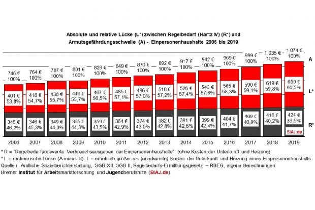 „Die absolute und relative rechnerische Lücke zwischen Regelbedarf (Hartz IV) (ohne Kosten der Unterkunft und Heizung) und Armutsgefährdungsschwelle ist auch 2019 weiter gewachsen“, stellt Paul. M. Schröder fest, nachdem er die neu ermittelte „Armutsgefährdungsschwelle“ für 2019 mit dem parallel geltenden Hartz-IV-Satz verglichen hat.