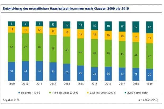 Der Blick auf die deutsche Statistik für Westdeutschland zeigt dann natürlich, dass dort immer mehr Menschen in diesen niedrigen Einkommensgruppen regelrecht abgehängt werden. Sie rutschen unter die langsam steigende Armutsgefährdungsschwelle, was die Quote in den westdeutschen Bundesländern nun so langsam auf ostdeutsches Niveau hebt.
