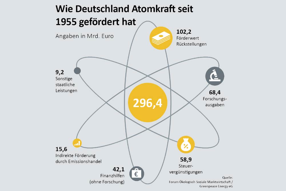 Das FÖS hat die seit 1955 erfassbaren Förderungen und staatlichen Ausgaben zusammengetragen. 287 Milliarden Euro machen in diesem Zeitraum allein direkte und indirekte staatliche Förderungen aus – wie etwa Finanzhilfen, Forschungsausgaben oder Steuervergünstigungen, aber auch Vorteile für Atomkonzerne durch den Emissionshandel oder eigene Rückstellungen. Weitere neun Milliarden Euro entfallen auf sonstige staatliche Kosten, etwa für Polizeieinsätze bei Castor-Transporten oder für von der Bundesrepublik übernommene Atom-Folgekosten als staatlicher Nachfolger der DDR.