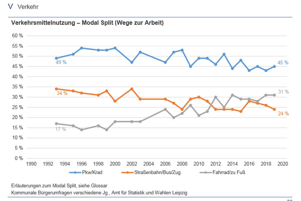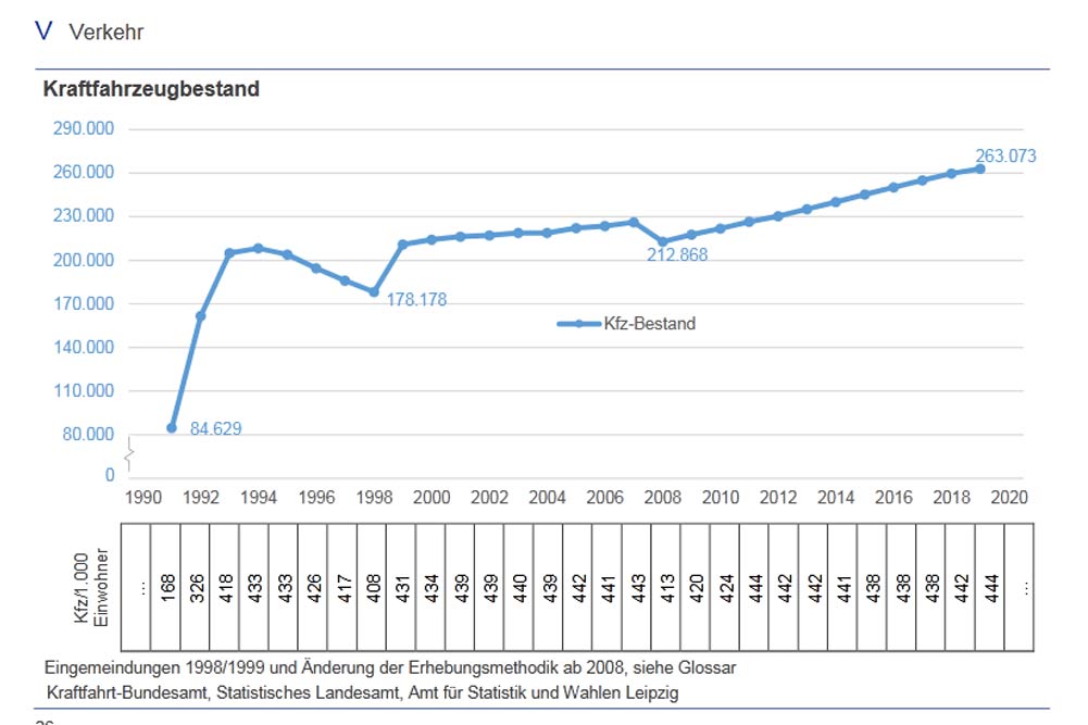 Was sogar in der Statistik der Verkehrsmittelnutzung sichtbar wird: Während die Zahl der Kraftfahrzeuge in Leipzig von 200.000 im Jahr 1993 auf 263.000 im Jahr 2019 wuchs, sank der Anteil der Autofahrten am Modal Split (also der täglichen Verkehrsmittelwahl der Leipziger) von 49 Prozent auf 45 Prozent (mit zwischenzeitlichen Spitzen auf fast 55 Prozent).