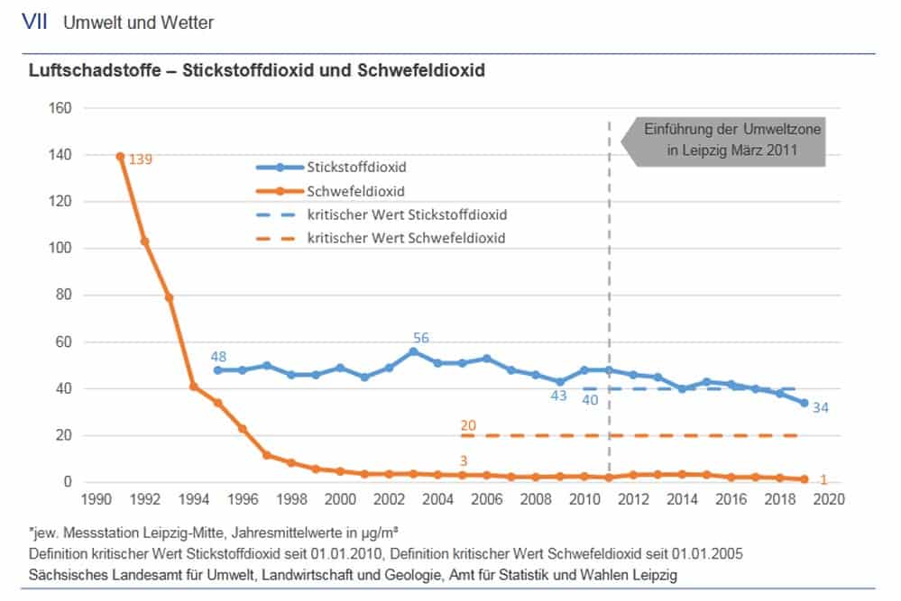 Erst danach wirkten sich die neu eingebauten Filtertechniken so langsam aus. Die Kurve zeigt aber auch, dass es Leipzig nie und nimmer geschafft hätte, die von der EU vorgegebenen Grenzwerte von 40 μg/m³ bei Stickstoffdioxid einzuhalten, wenn Leipzig nicht 2011 die Umweltzone eingeführt hätte.