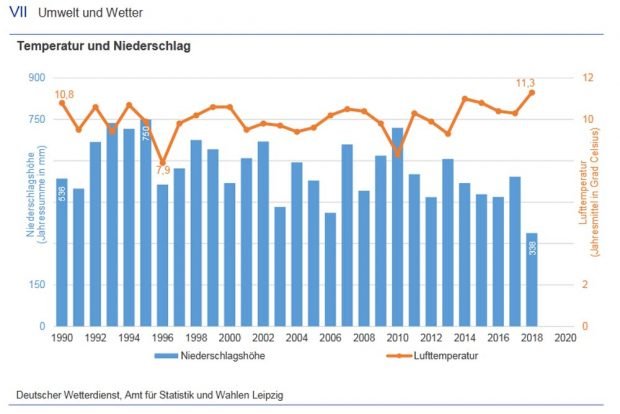 Die Grafik zu Niederschlägen und Lufttemperaturen (ganz oben) sieht zwar auf den ersten Blick nicht so dramatisch aus. Aber wer sich die systematisch zurückgehenden Niederschlagsmengen anschaut, bekommt eine Ahnung davon, dass die Jahre 2018 und 2019 keine Ausnahme mehr sind, sondern künftig noch viel mehr solcher Dürrejahre auf Leipzig zukommen – mit vertrockneten Bäumen, verbrannten Wiesen und einem Auenwald, der verzweifelt nach Wasser jappst.