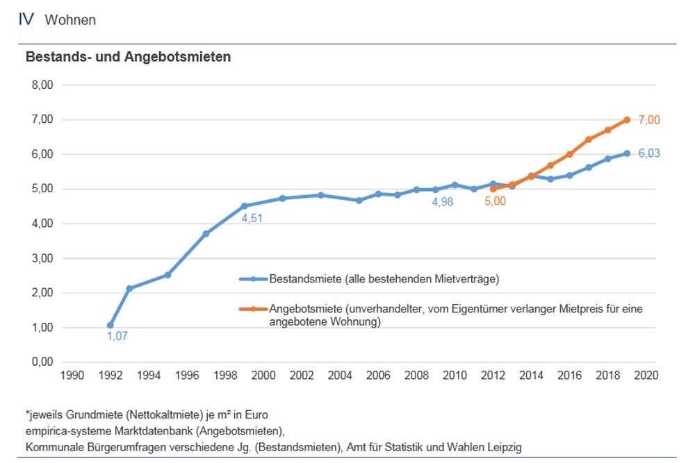 Denn wenn die Erwerbstätigen in einer Stadt nicht mehr Geld verdienen, haben Vermieter auch keine Chancen, die Mieten spürbar anzuheben. Bis 2012 blieb deshalb das Mietniveau in Leipzig fast konstant bei 5 Euro. Erst danach begannen die Bestands- und die Angebotsmieten deutlich zu steigen.