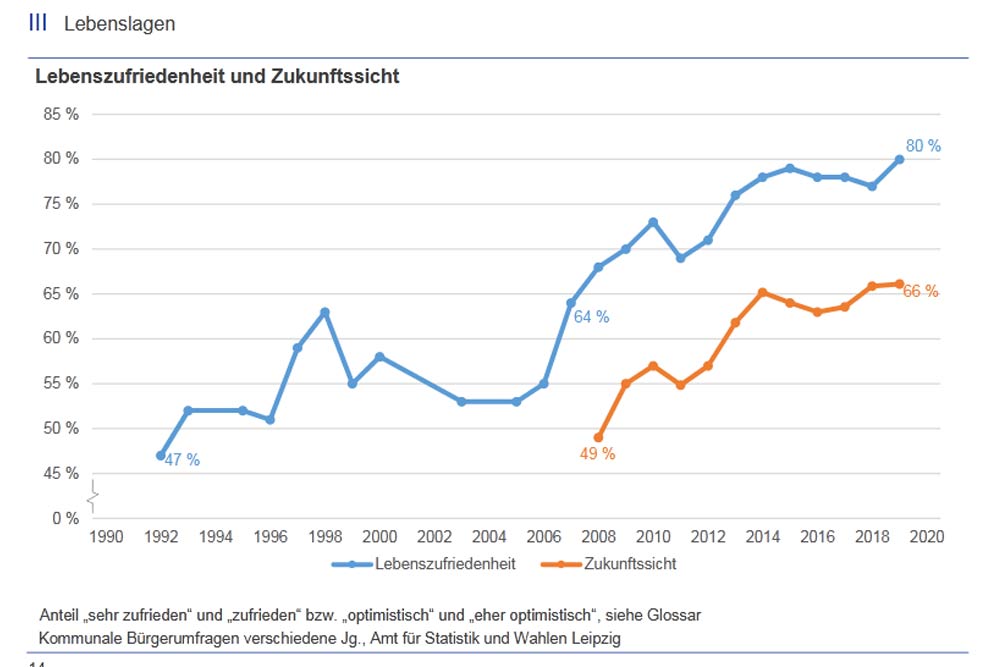 Deswegen verwundert es nicht, dass sich die Lebenszufriedenheit und die Zukunftssicht genau ab diesem Zeitpunkt aufhellten. Ab 2006 übrigens auch durch das Wissen darum, wieder in einer wachsenden Stadt zu leben, denn da verkündete die Stadt dann auch die erfreuliche Tatsache, dass Leipzig nach 15 bitteren Jahren endlich wieder Halbmillionenstadt war.